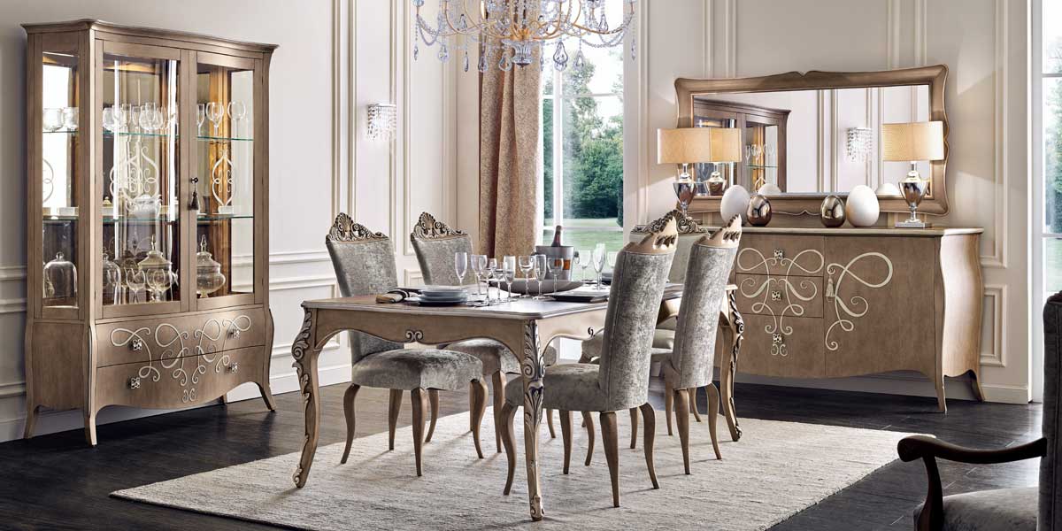 The charming display cabinet and sideboard both in cherry wood are enriched by an elegant embossed decoration.