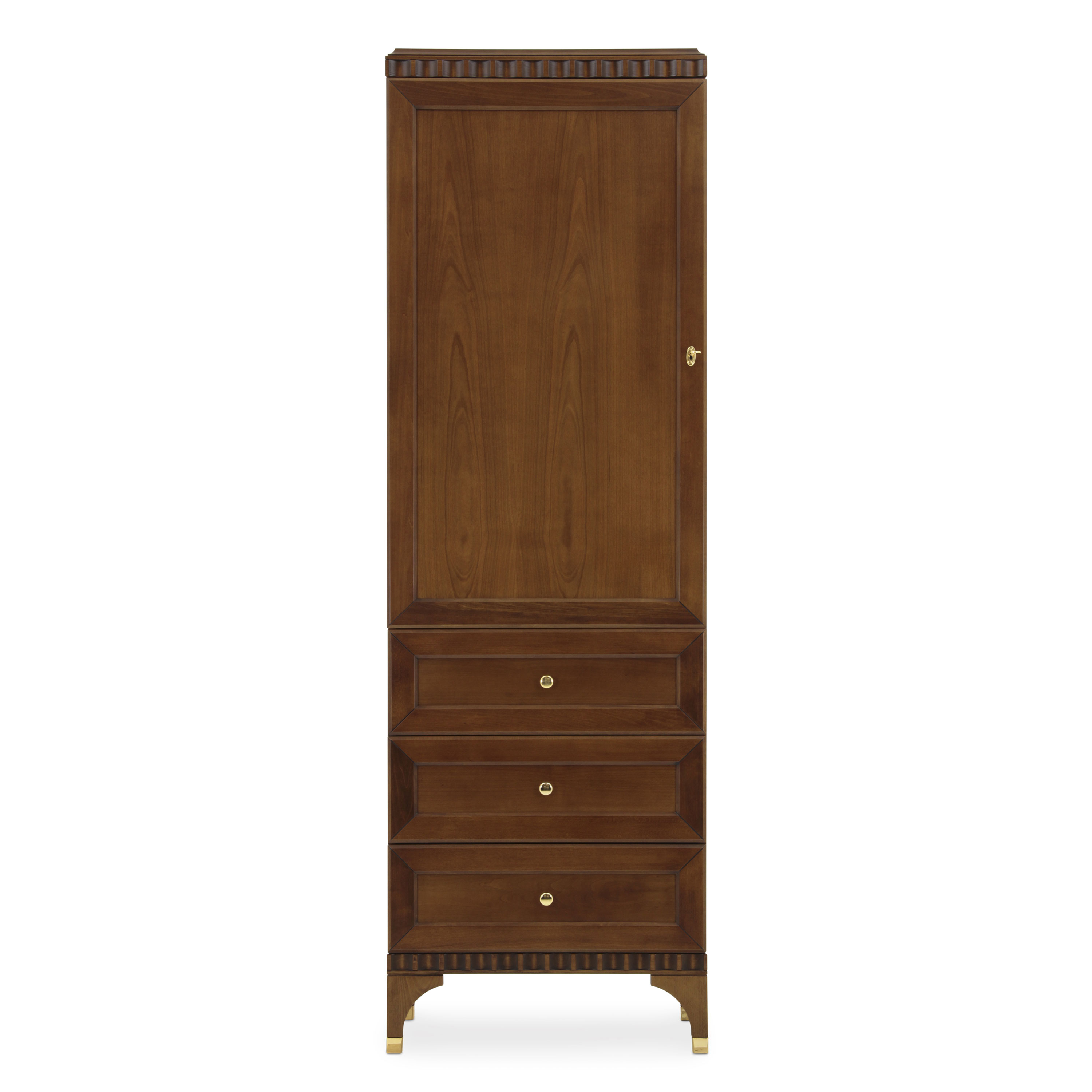 Modern one-door bookcase with three drawers and cherry wood structure. The top quality materials used make this item versatile and suitable for use in public or private spaces. This product has been exclusively designed by our architects. The polished finish and metal parts can be selected from those available, as for all our products.