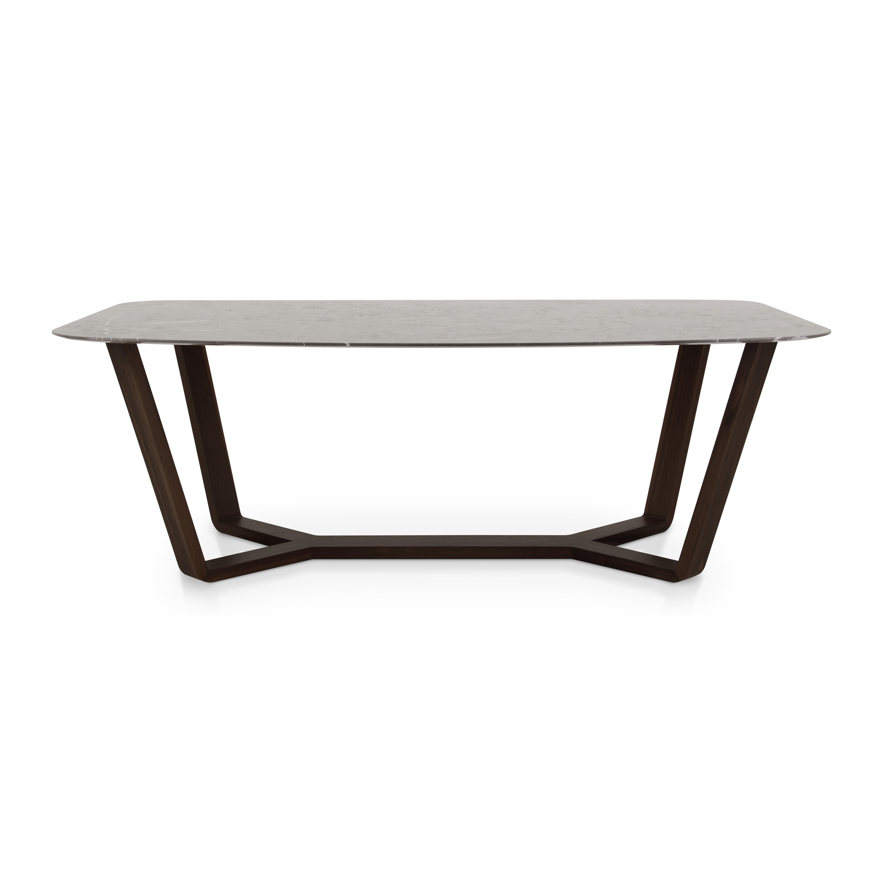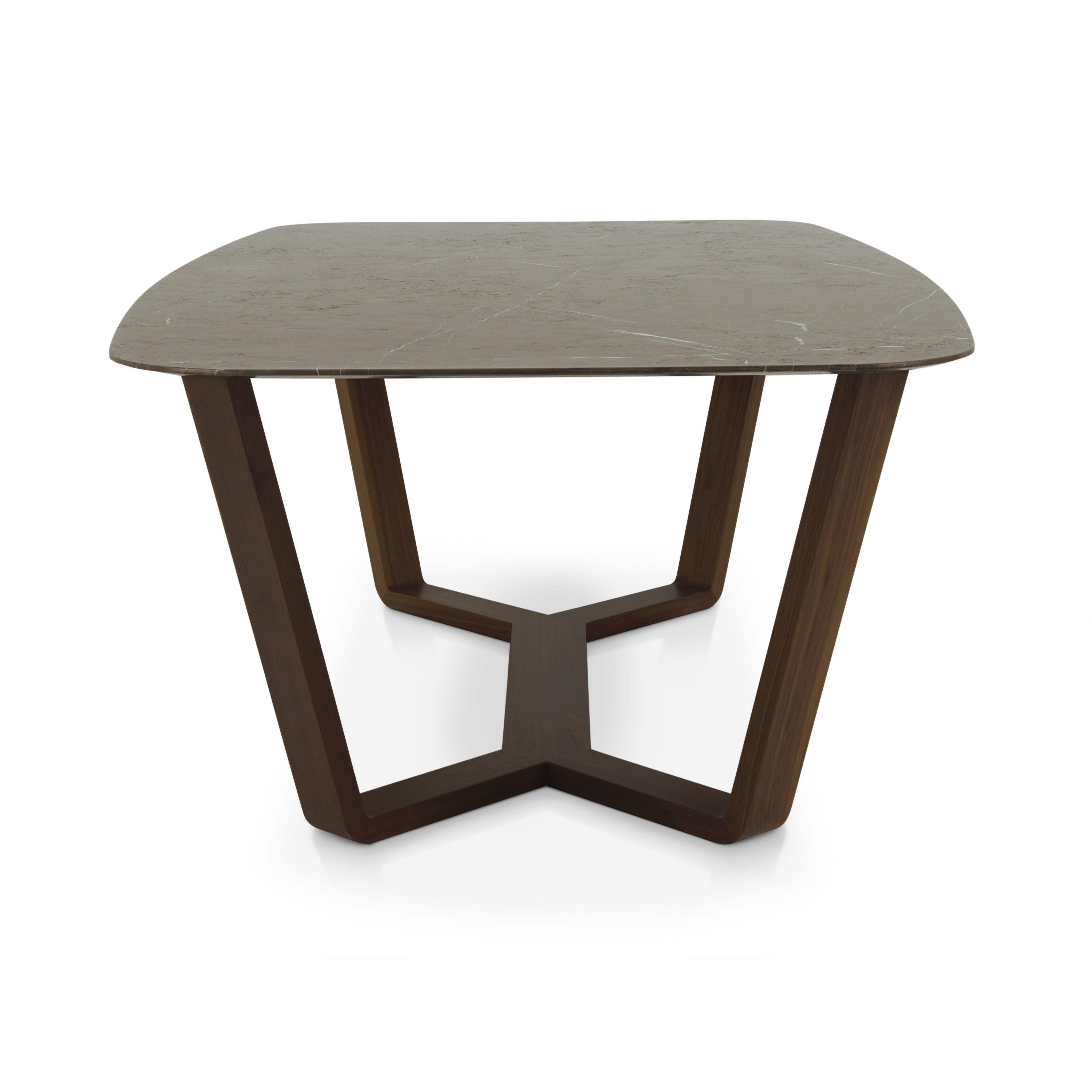 Elegant table with markedly modern lines, walnut structure and marble top.