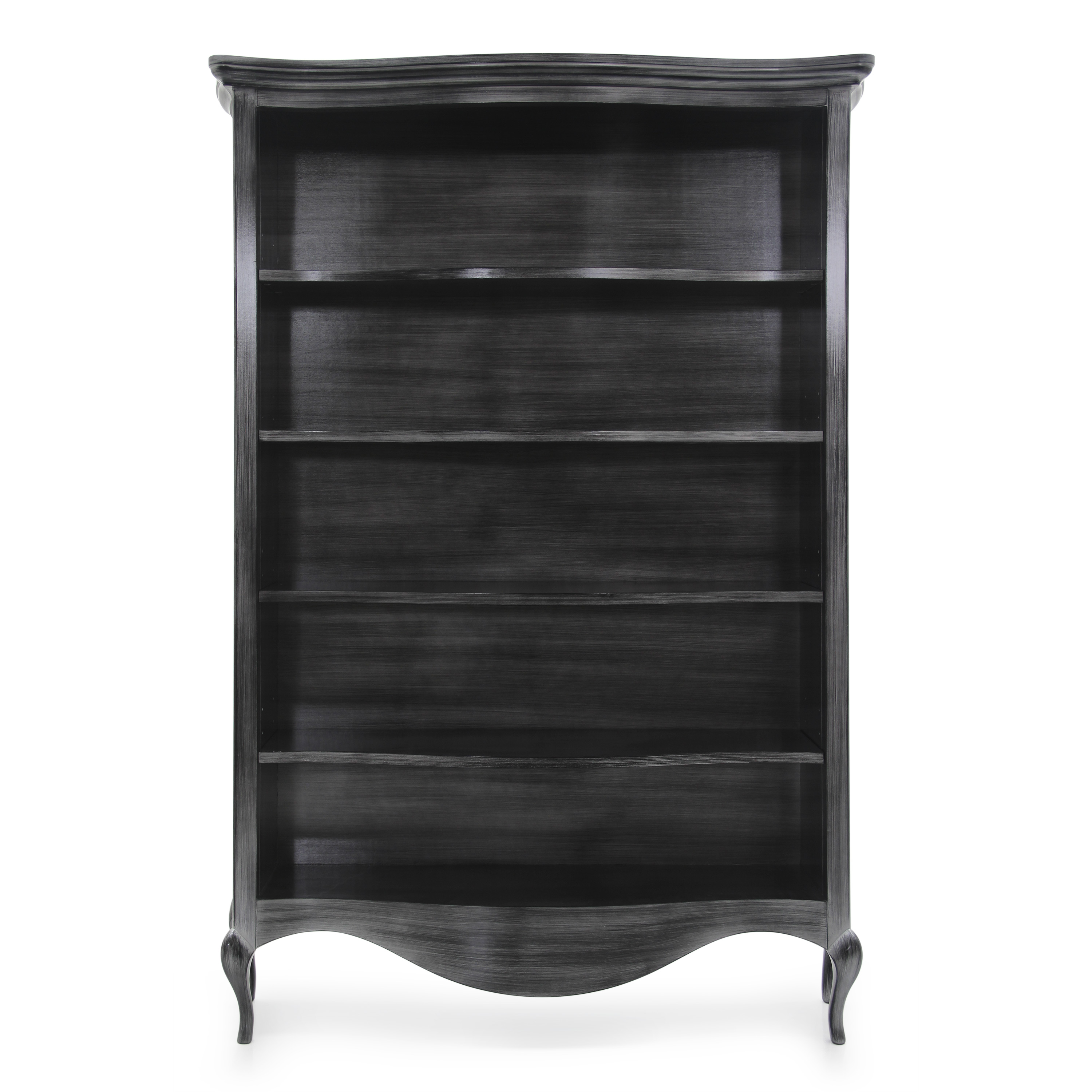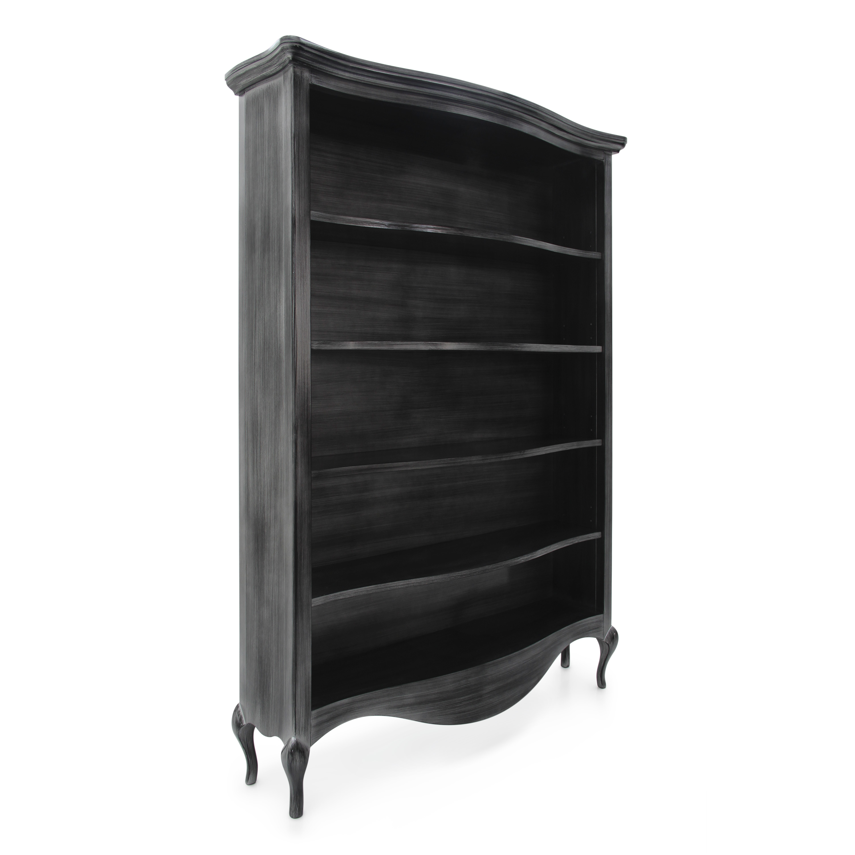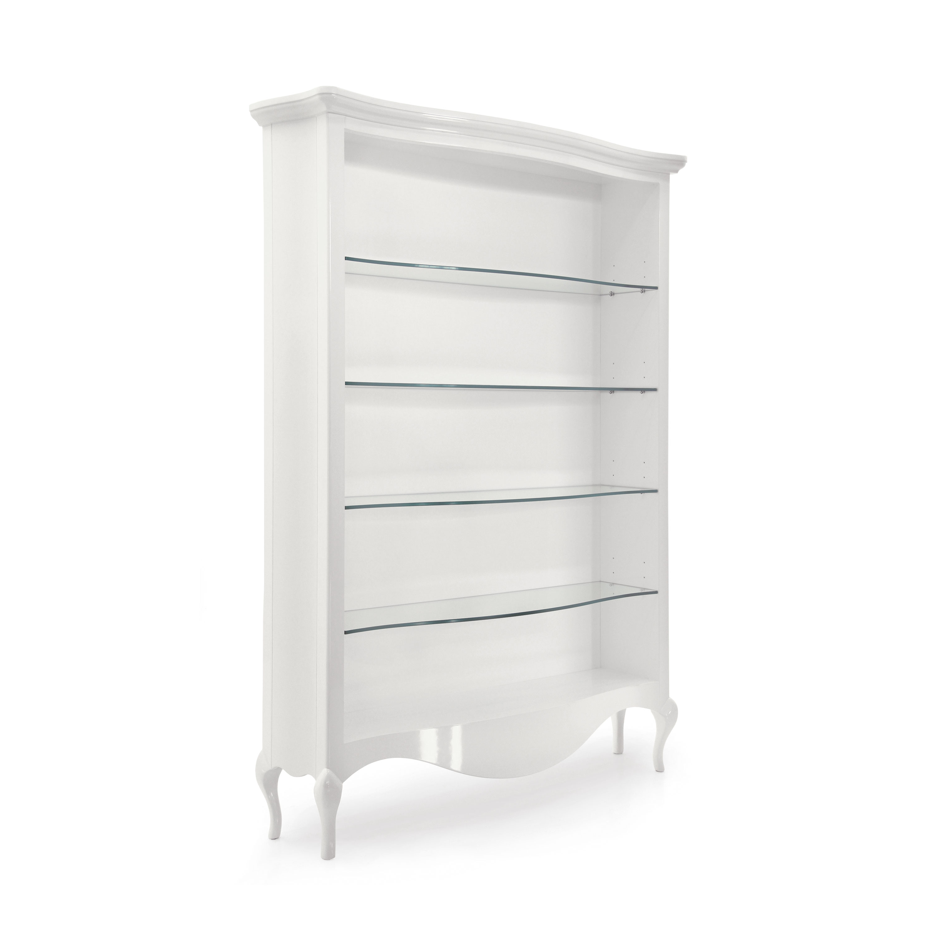 It features four shelves and can be enhanced with a glossy lacquer finish or with a gold or silver leaf finish.