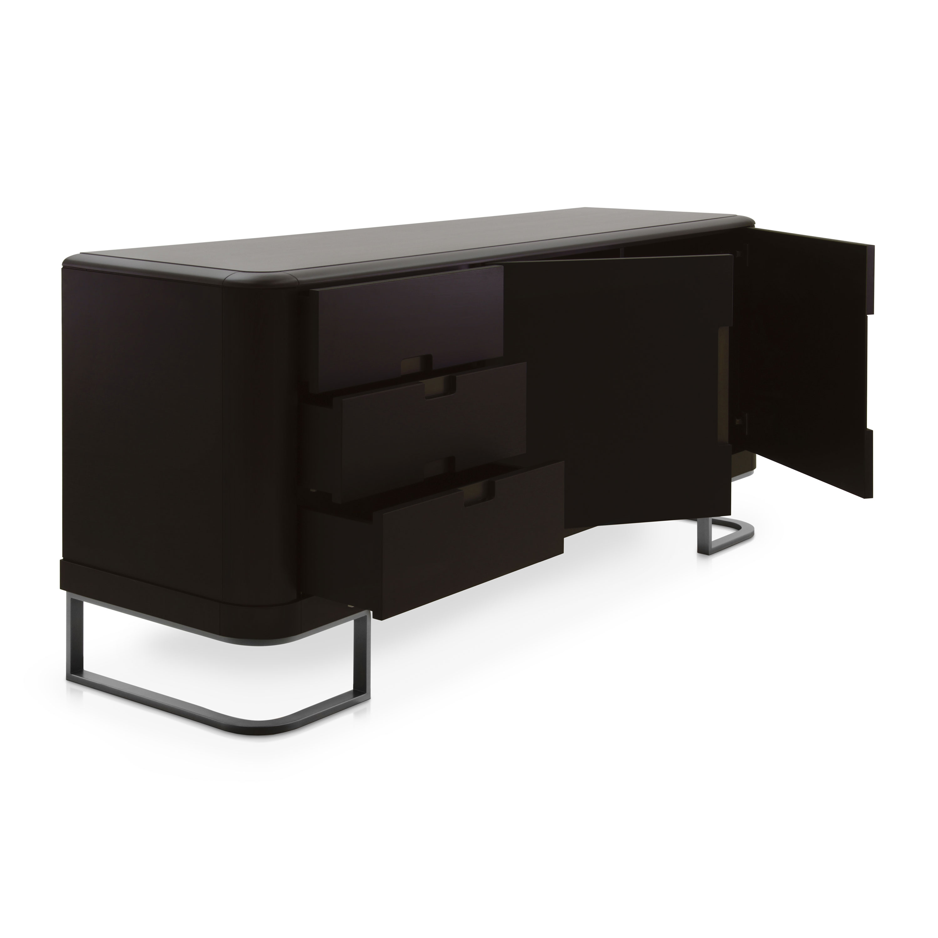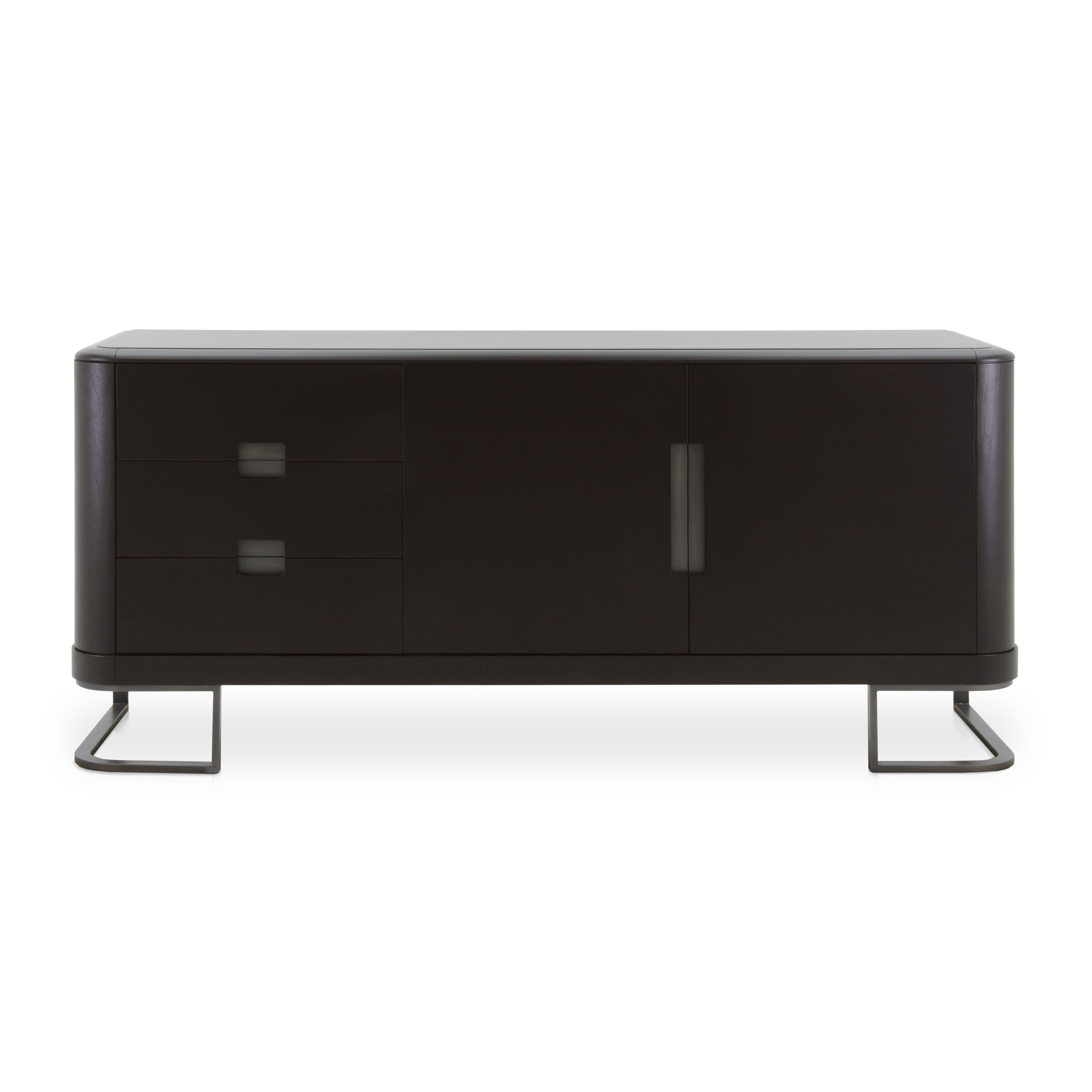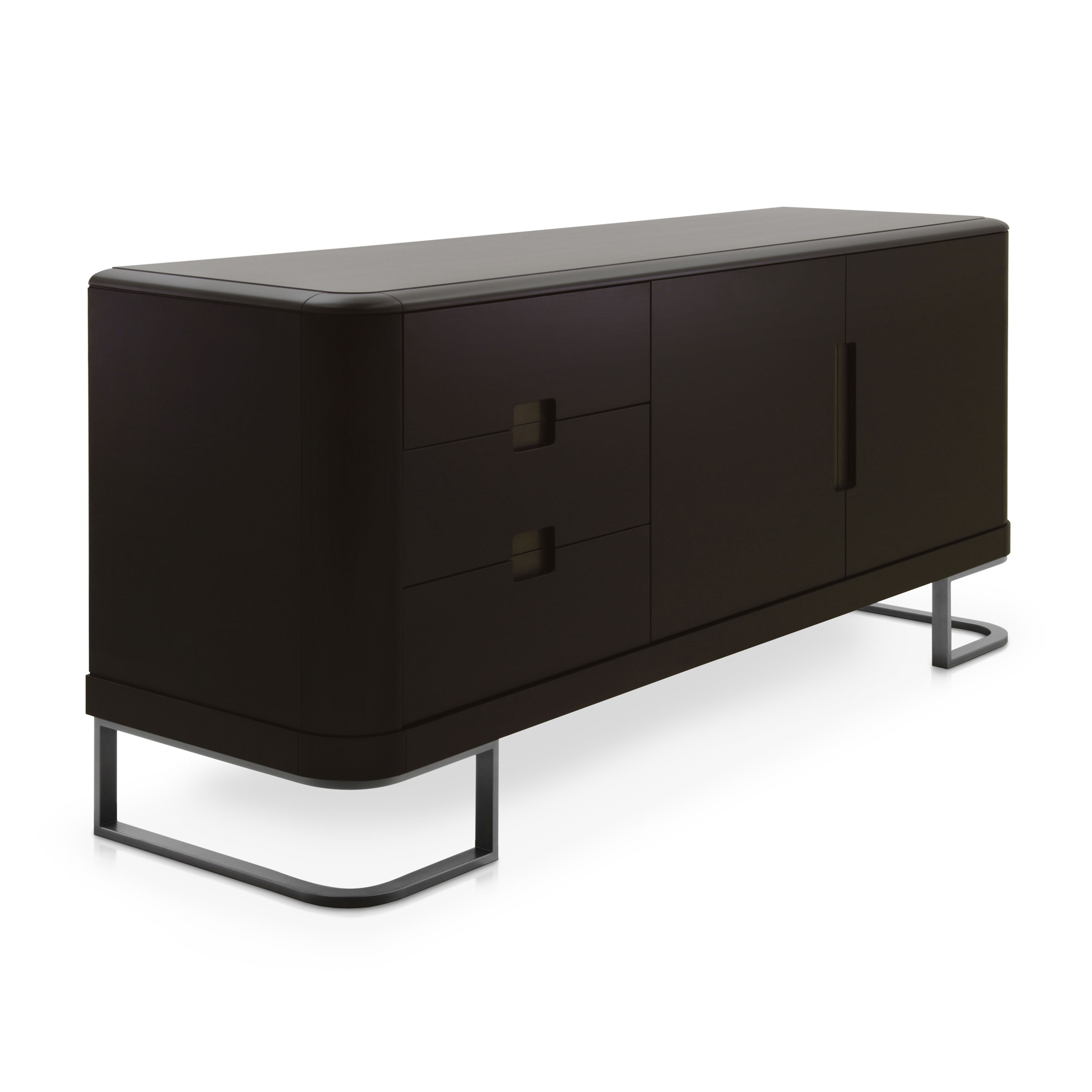 Modern sideboard with distinctive lines, featuring two doors and three drawers and walnut structure.