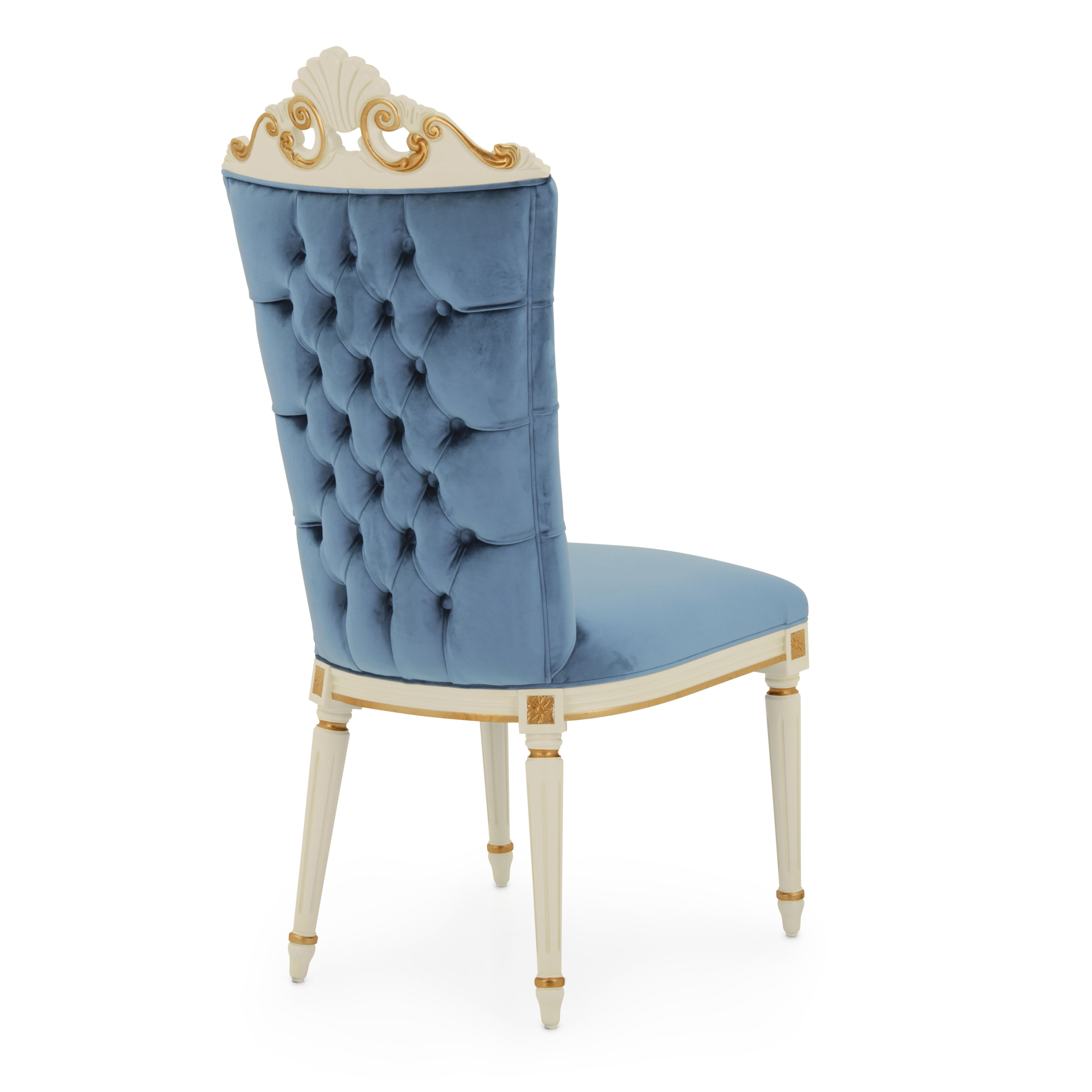 Custom dining chair tailored to meet our client’s request. This exquisite piece features a tufted backrest in luxurious blue velvet, exuding sophistication and comfort. The chair incorporates carved elements, such as the crown emblematic of the ornate Baroque style, harmoniously blended with sleek legs inspired by our Louis-style chairs. Finished with a cream lacquer and accented with gold leaf details, this dining chair is truly one of a kind.