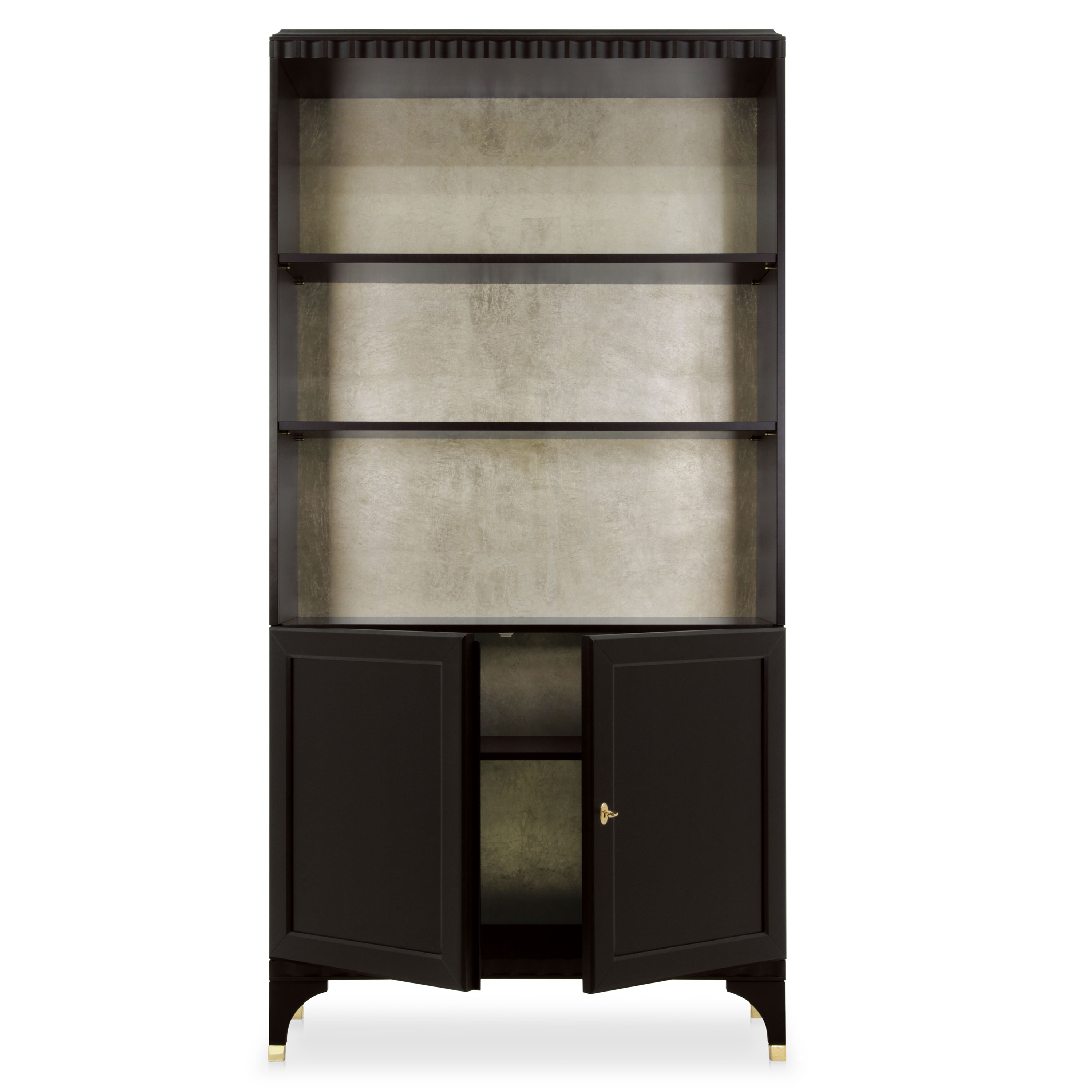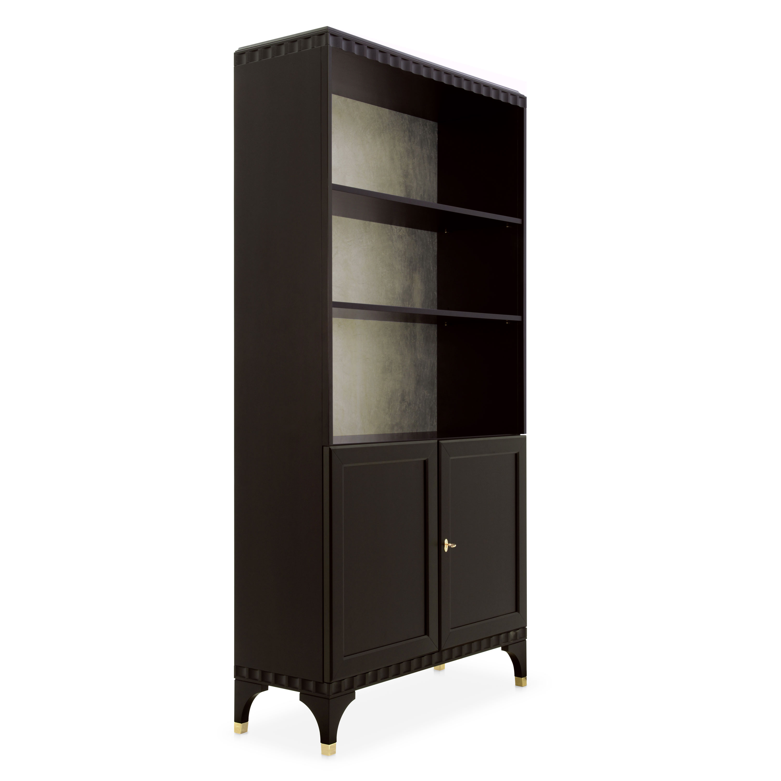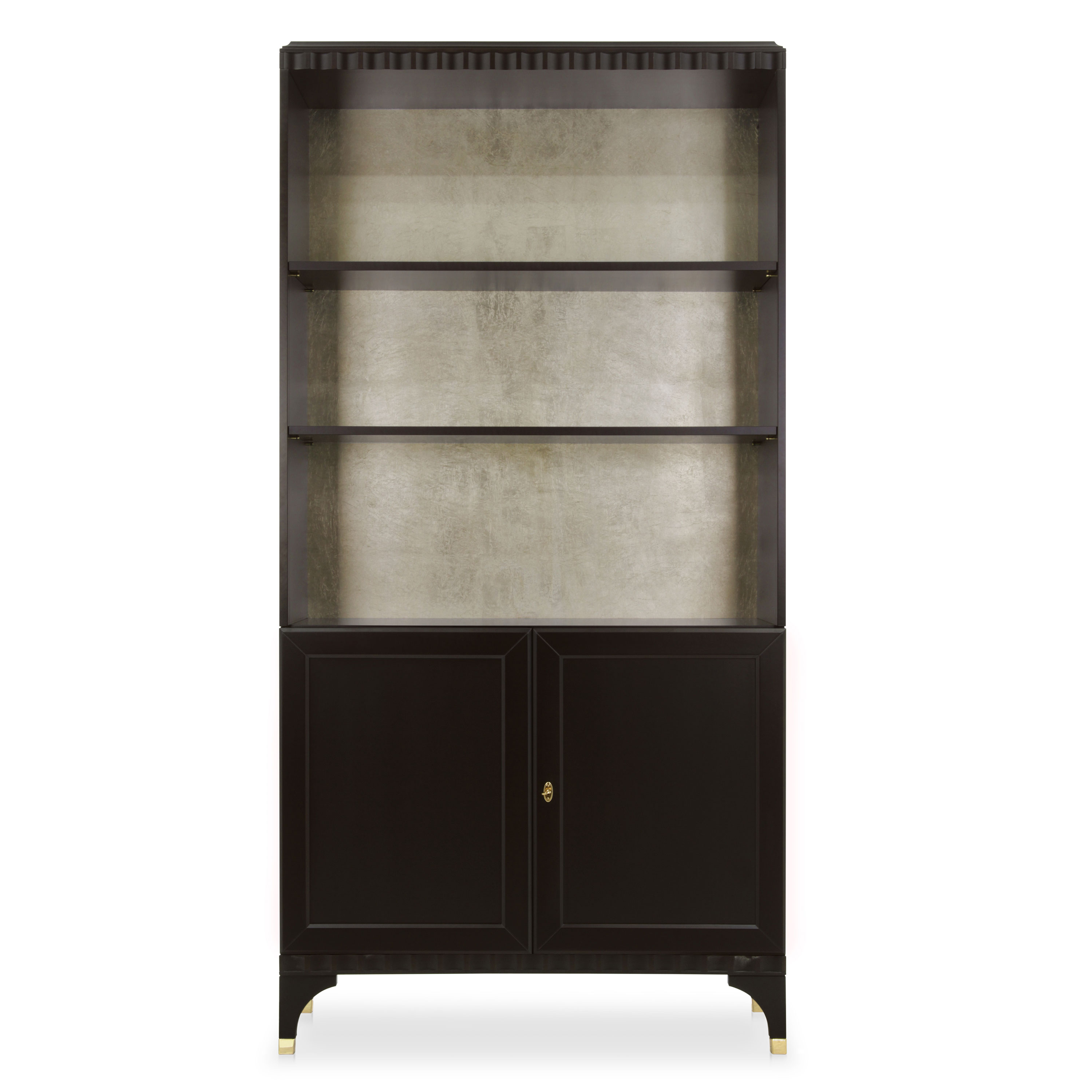 Two door Modern style bookcase with two shelves and cherry wood structure.