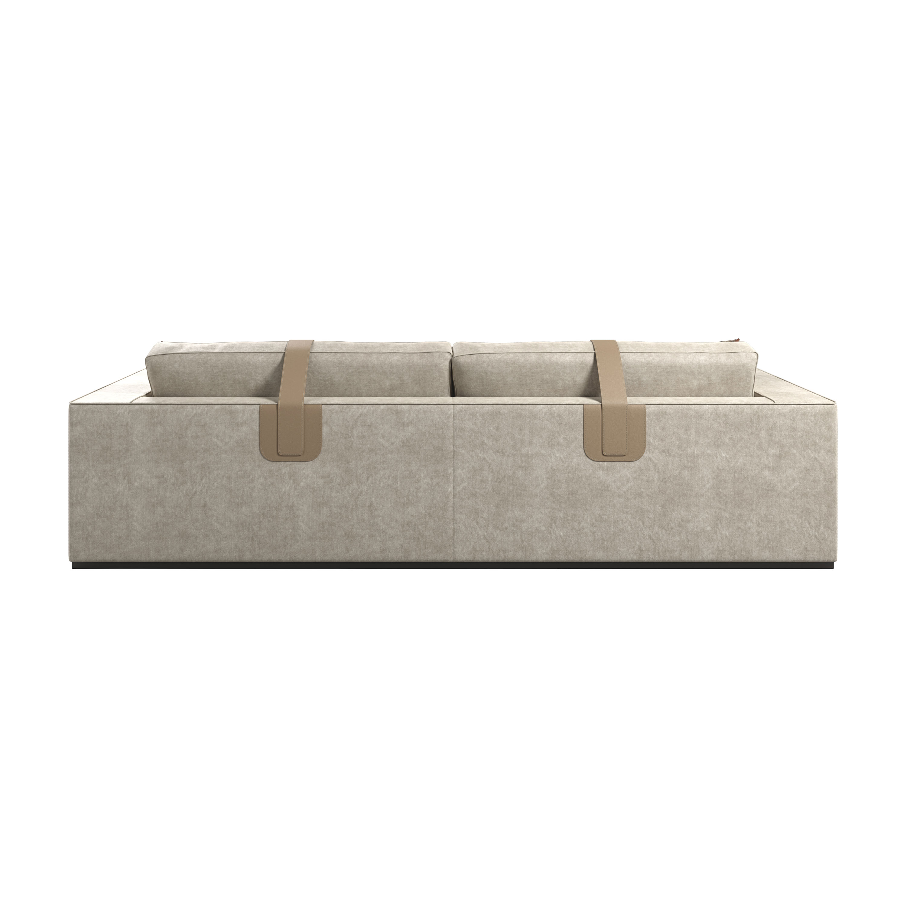 Distinctive beige leather belts with matching buckles wrap the structure, introducing a unique designer detail that enhances the overall composition with a subtle yet striking decorative accent. These elements add rhythm and character, elevating the sofa beyond a purely functional piece.