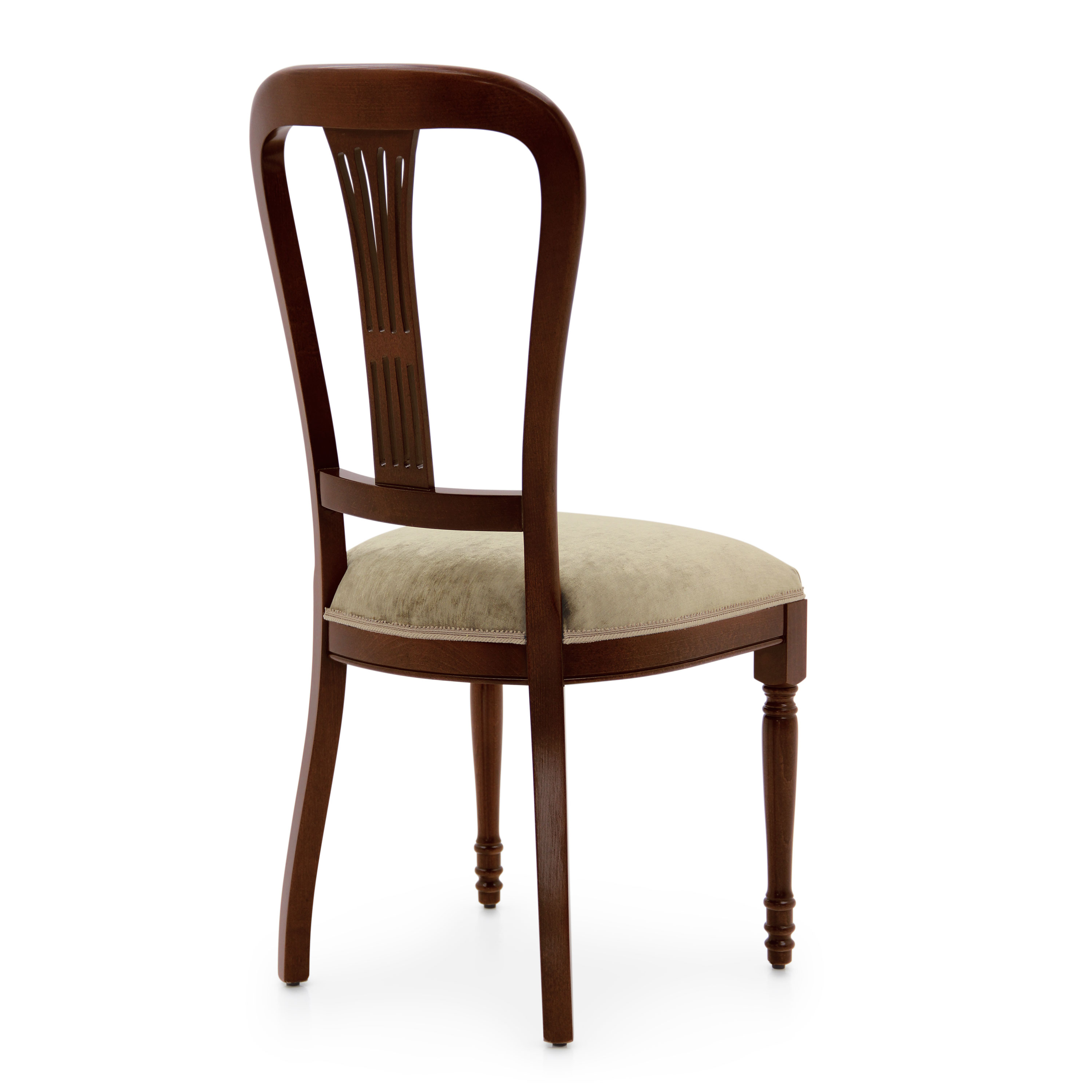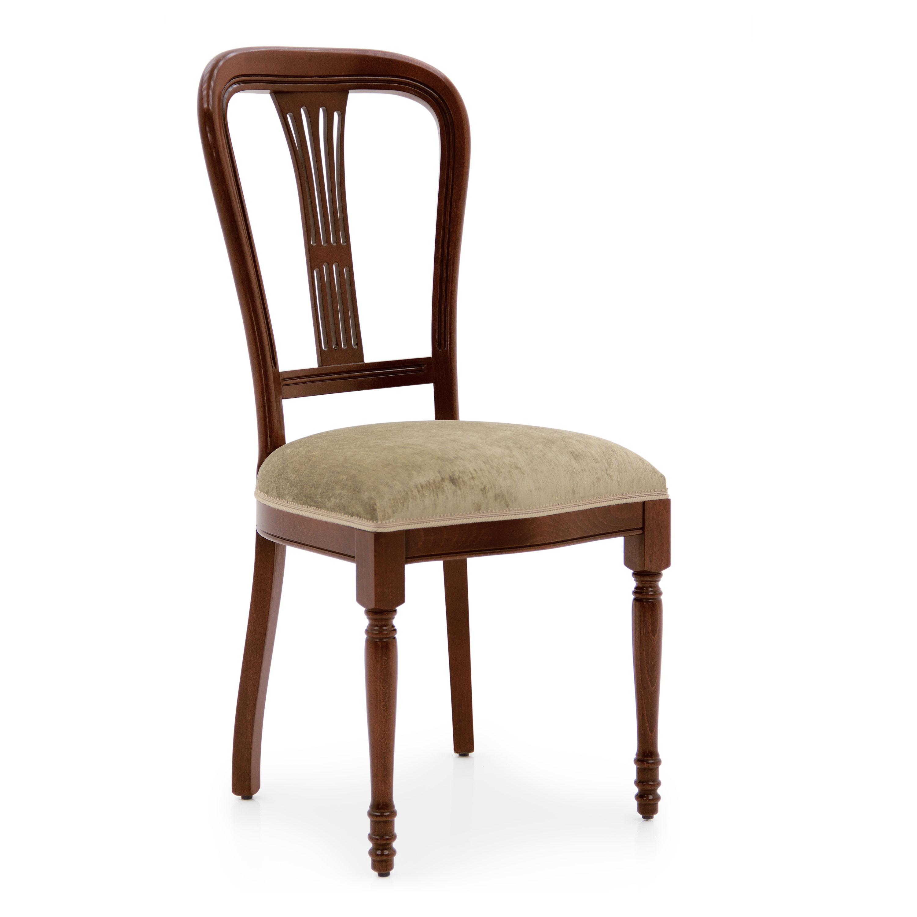 Moderna is a classic Italian chair, with a solid beech wood structure. The seat is padded with webbing, three springs and superior quality foam. Upholstery can be customised with nails, braiding, double welt or welt. 100% made in Italy.
