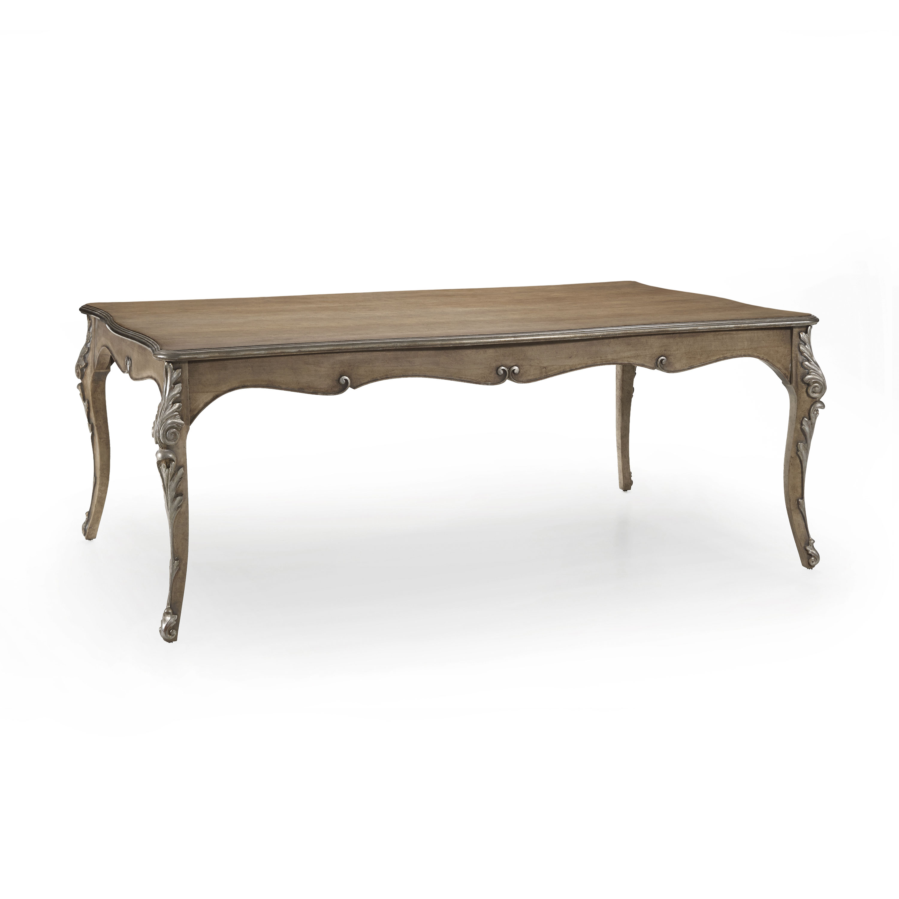 Refined rectangular wooden table that can be easily combined with Classic Baroque style furniture. It features an extendable top mechanism. The carvings on the legs and on the side band can be enhanced with a silver or gold leaf lacquer finish.