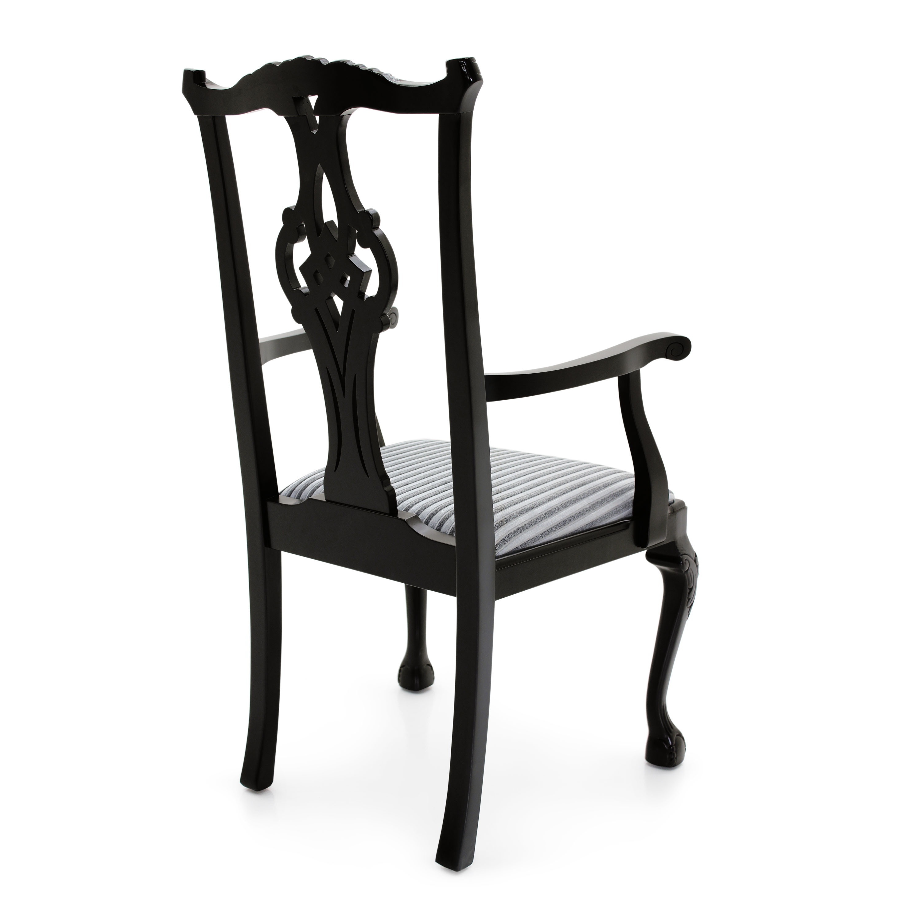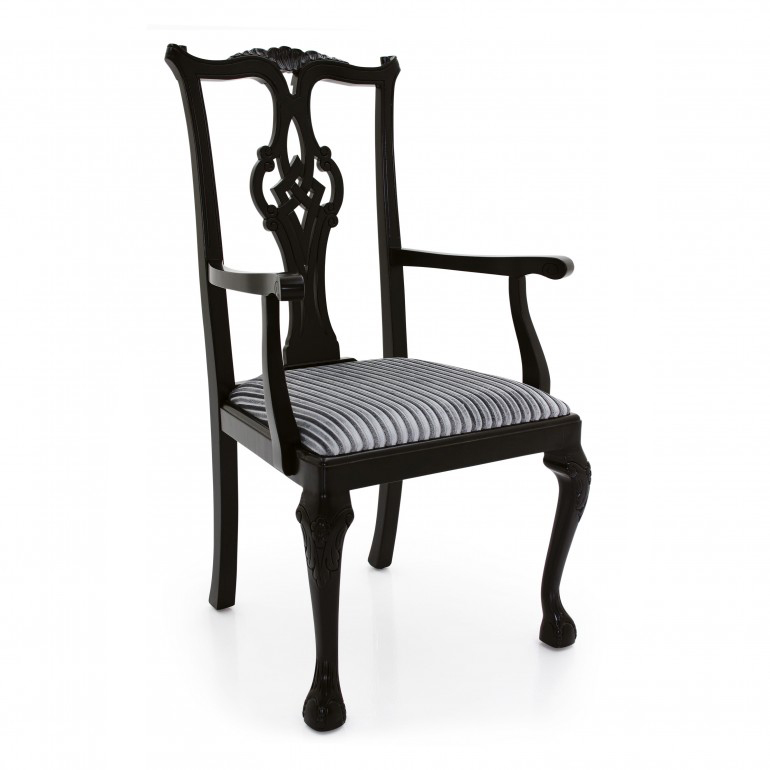 Elegant classic style small armchair with beech wood structure featuring a particularly elaborate back.