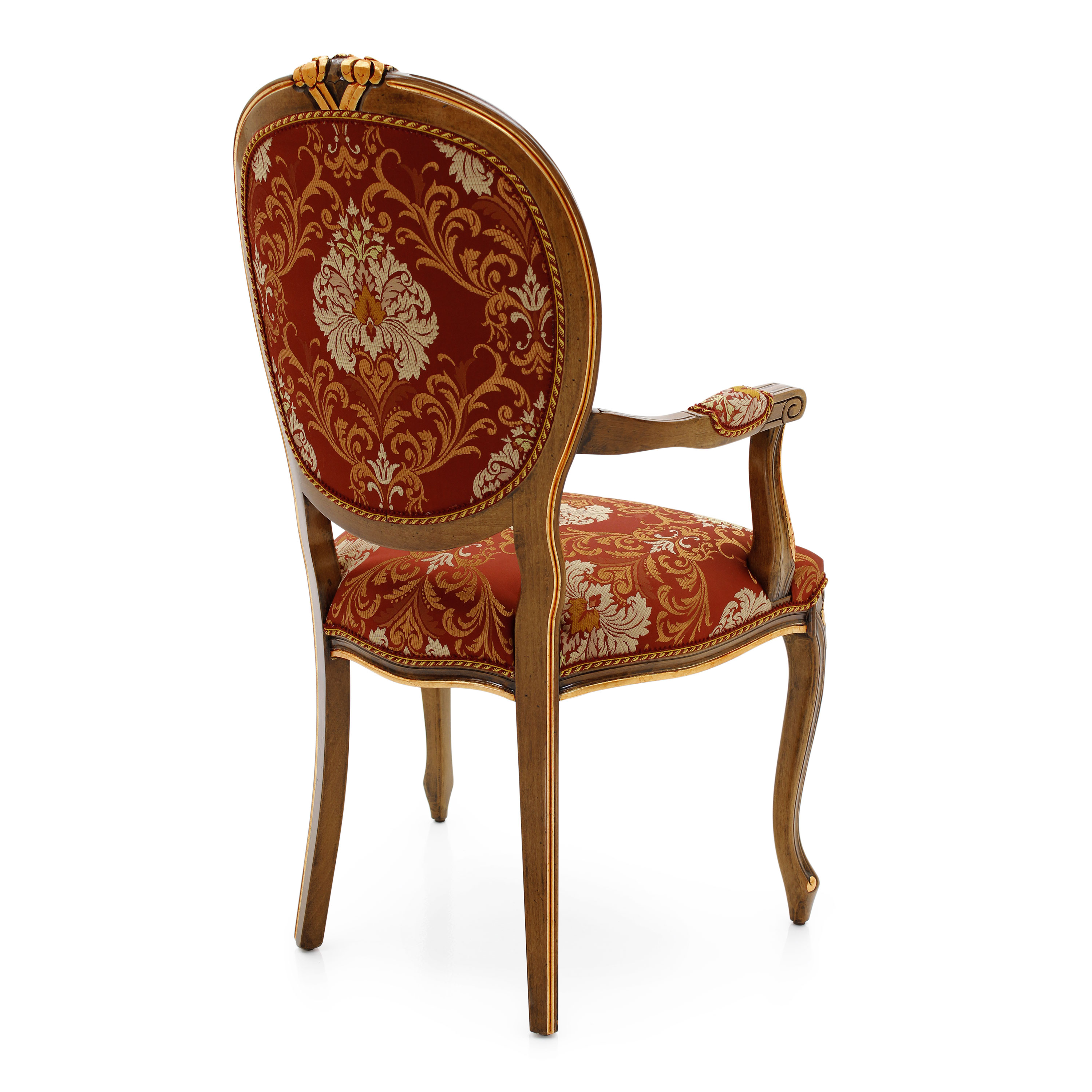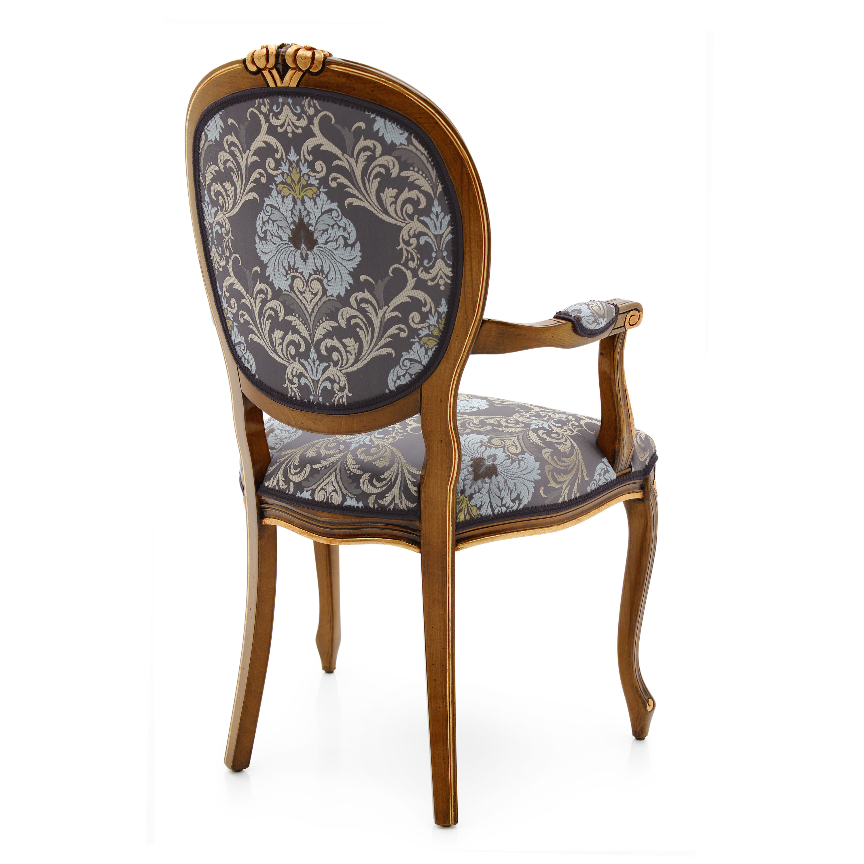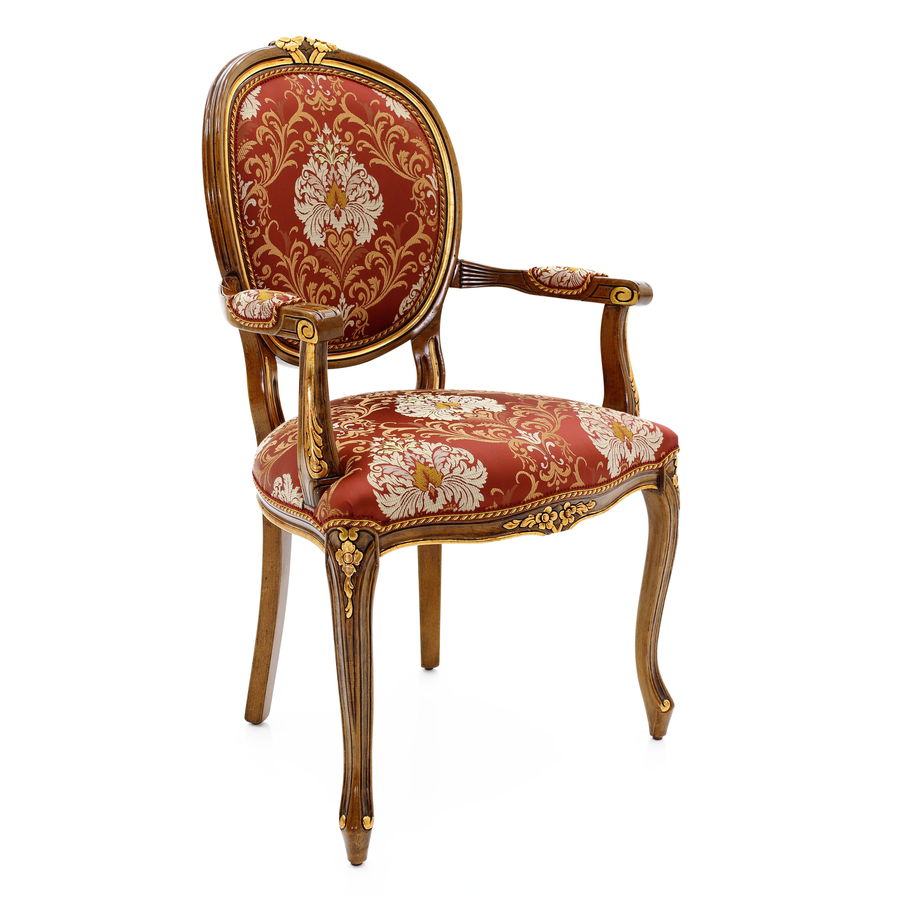 Comfortable classic style small armchair with beech wood structure. The carvings on the legs and back can be enhanced with a silver or gold leaf lacquer finish. The seat is padded with webbing, springs and superior quality foam. The upholstery can be customised with nails, braiding, double welt or welt.