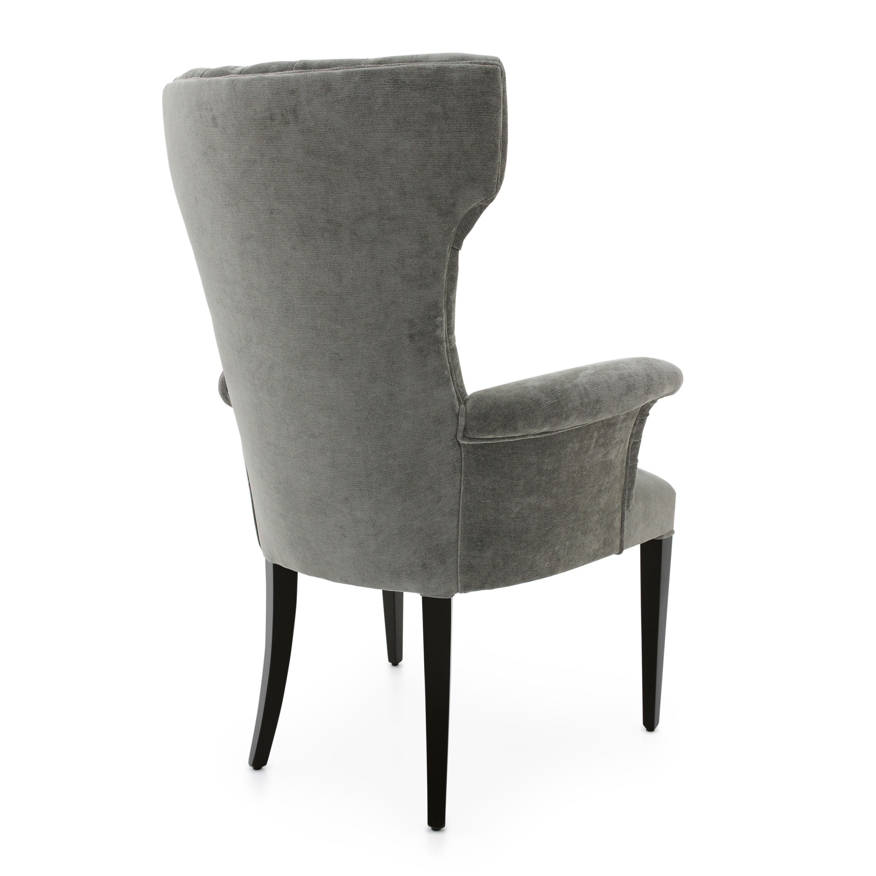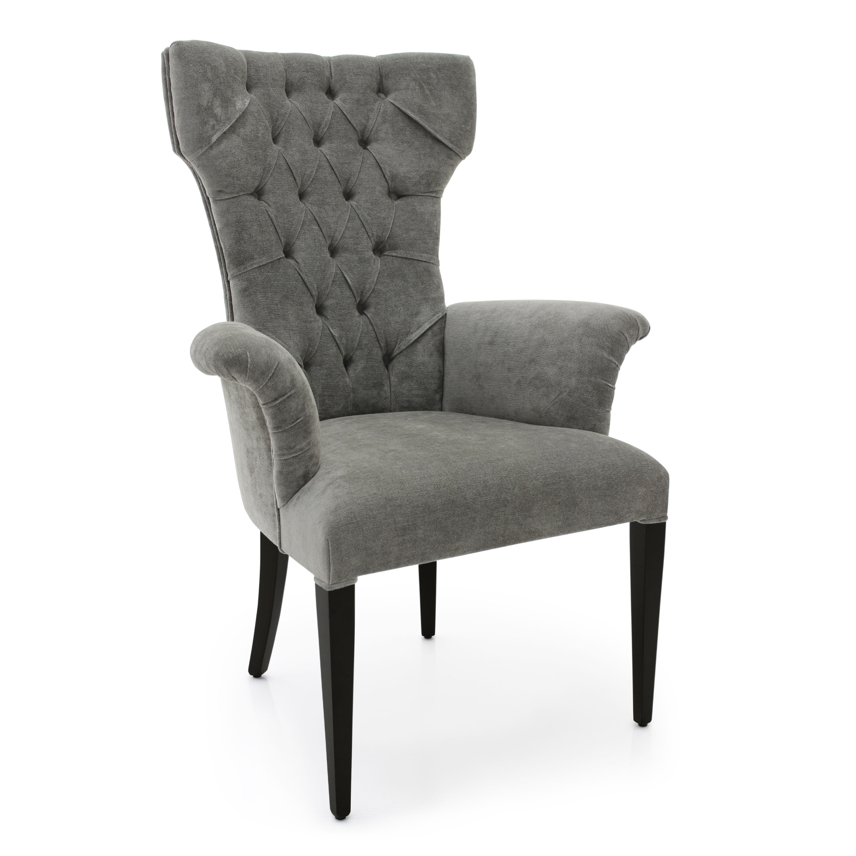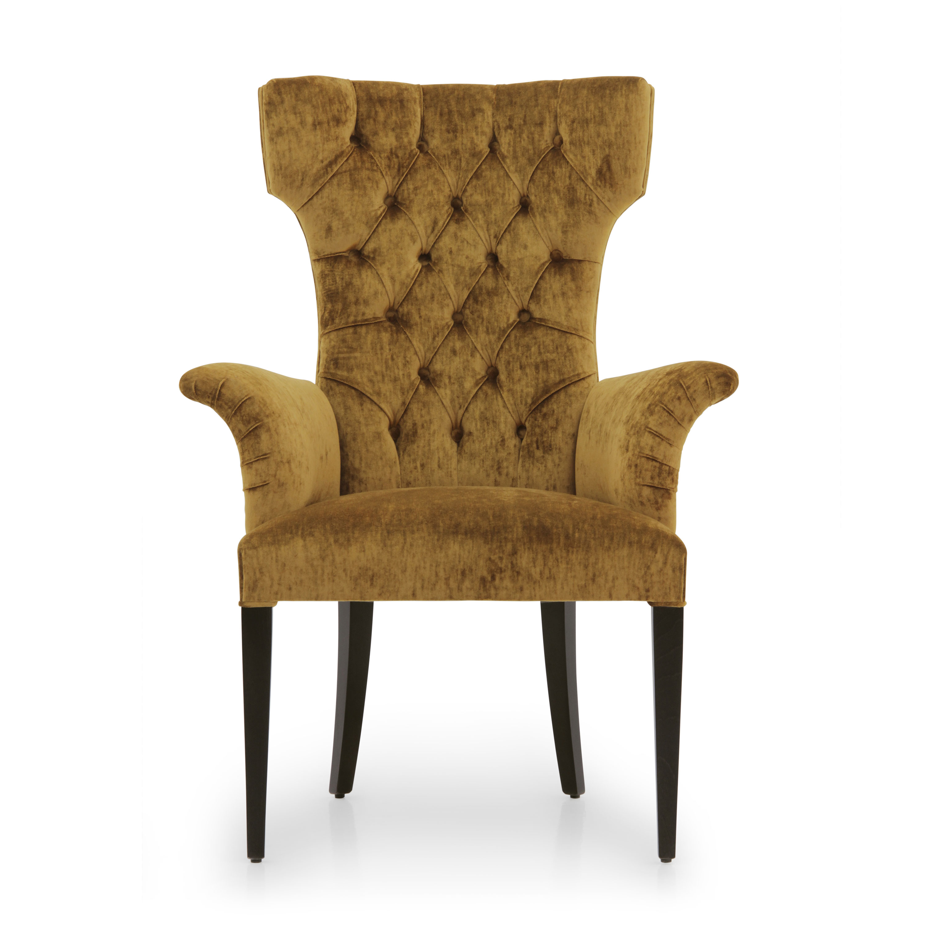 Comfortable modern style small armchair with beech wood structure featuring a wide deep-buttoned back and striking fully upholstered armrests.