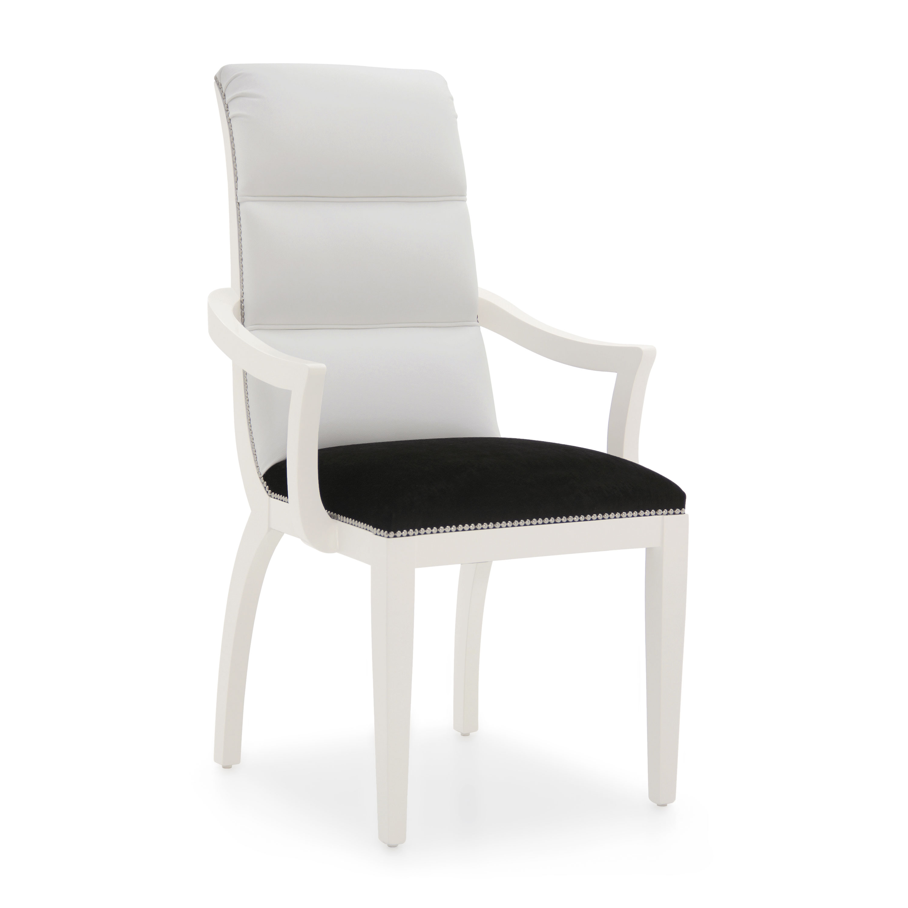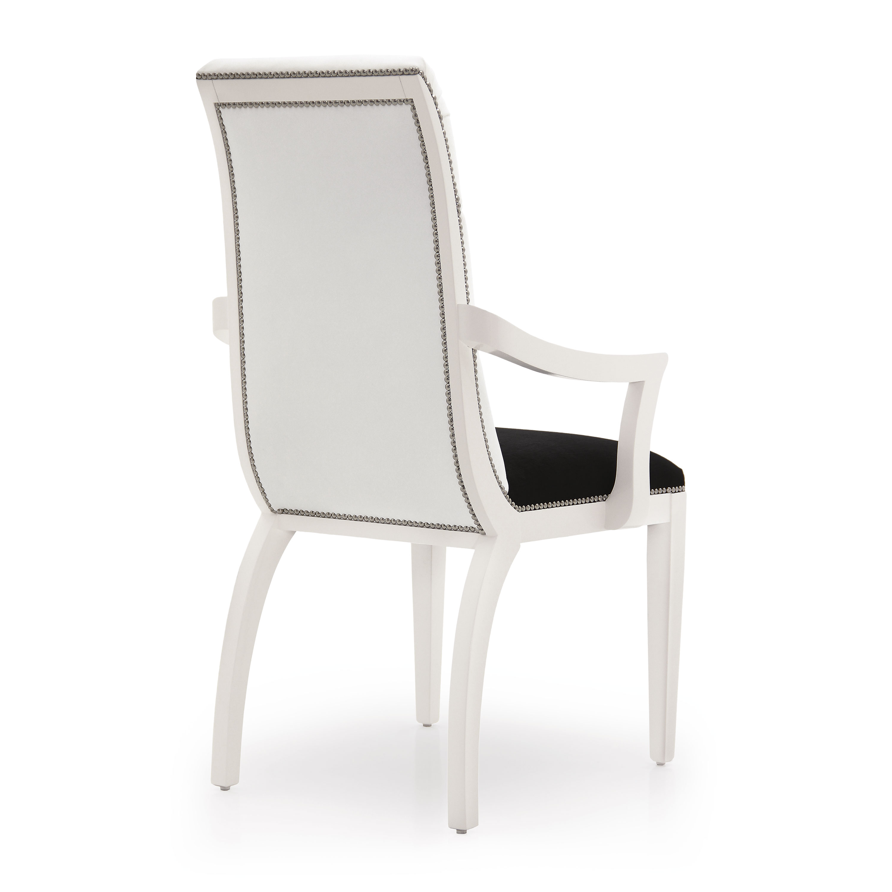 Comfortable Contemporary style small armchair with beech wood structure and rather sinuous lines. It is upholstered with webbing, springs and superior quality foam. The upholstery can be customised with nails, braiding, double welt or welt.