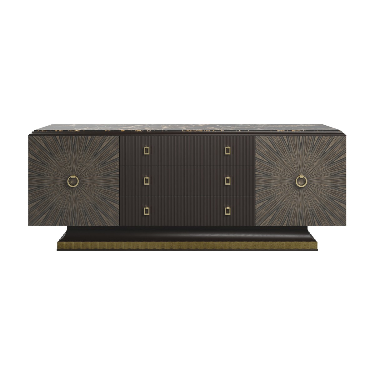 The setting is completed by a luxurious Orvia sideboard, with a Portoro gold marble top and Ebony Macassar doors, offering bespoke options that balance functionality and character.